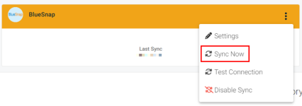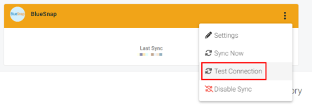 You should then see a successful test notification appear in the lower left-hand corner. Once this confirmation is seen, you can then select the 3 dots in the upper right corner of the BlueSnap integration and select Sync Now.