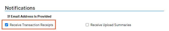 NOTE If you would like to have a copy of transaction receipts sent to the email in the user profile when a payment is triggered through the software integration, check the notification preference "Receive Transaction Receipts".