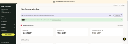 IMPORTANT It may take some time for GoCardless to complete verification on some of the items on the account (i.e., verification of the bank account). Be sure to check your email for updates from GoCardless in case additional documentation or information is needed to complete your account setup.