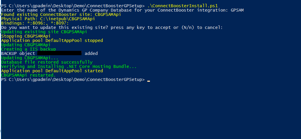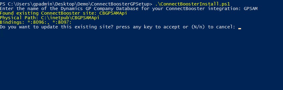This PowerShell script is the core part of your GP install. This will prompt for the required parameters $DynamicsDatabaseName, $Port, and $Domain . These are the steps needed for a successful installation: