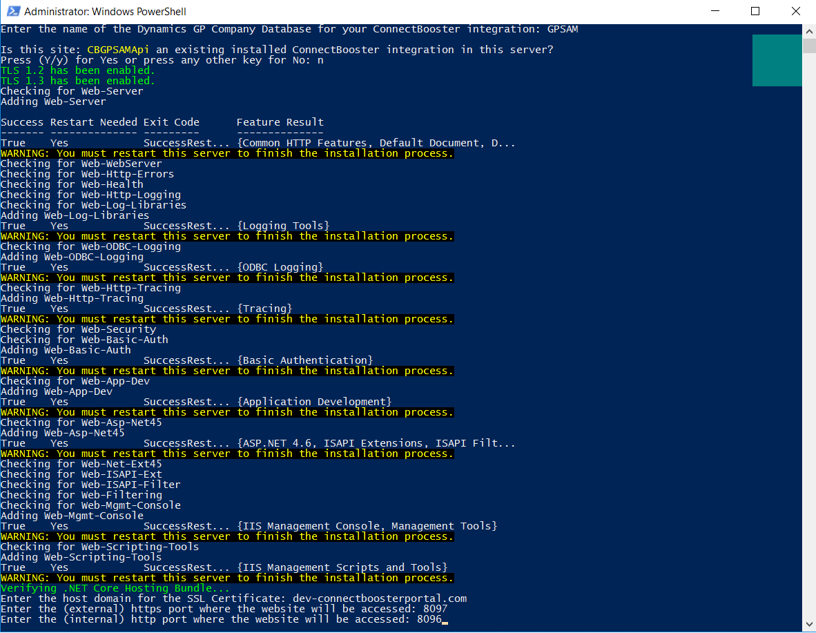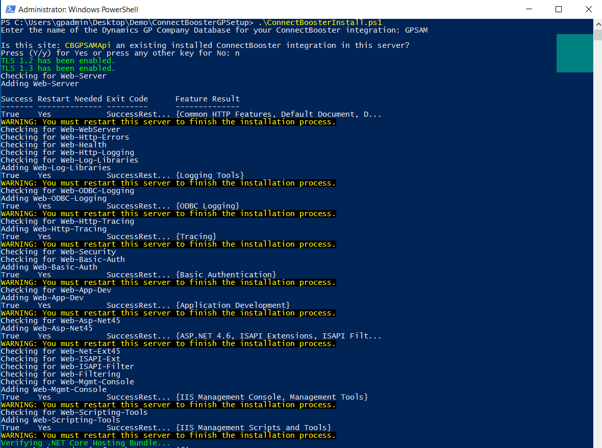 NOTE There might be a WARNING: You must restart this server to finish the installation process. prompt. You just need to restart the server if the app is not responding. This will only get prompted in first install or if features are missing from the server.