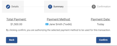 Lastly select "Confirm" and the payment will initiate or schedule appropriately. The payment confirmation window appears, and the automated email receipt sends out.![]()
