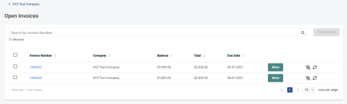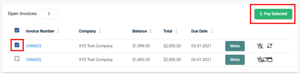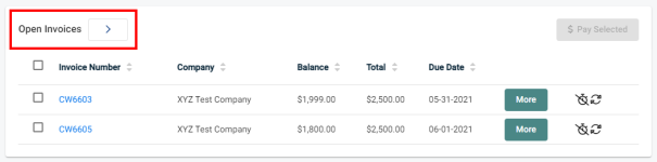 Clicking on "Open Invoices" will bring you to the dedicated Open Invoices page. This is useful when dealing with a larger quantity of invoices. Selecting an invoice will again enable the "PAY SELECTED" button. ![]()