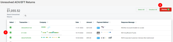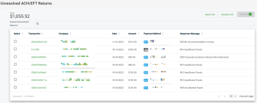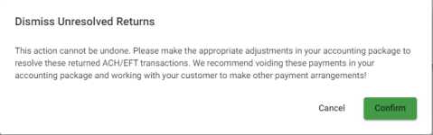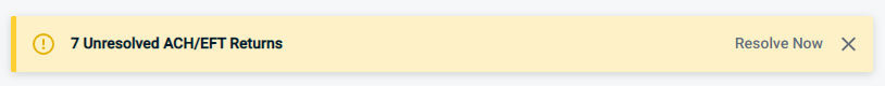 Choosing “Resolve Now” will allow you to view each unresolved return in detail prior to dismissing them. Please make the appropriate adjustments in your accounting package to resolve the returned ACH/EFT transactions. We recommend voiding these payments in your accounting package and working with the organization to make other payment arrangements.![]()